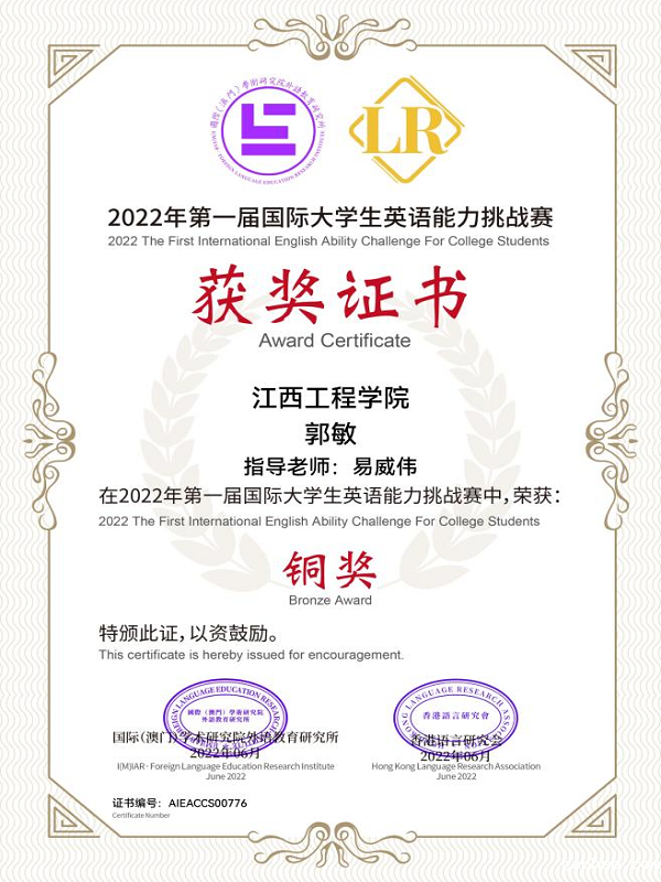 学院创新“以用导学、以用促学,以赛导学、以赛促学”的“双导双促”竞赛模式,始终坚持“学校苦抓、教师苦教、学生苦练”,很多赛事创造了与名牌大学同场竞技、同台领奖的优异成绩。随着我校转型发展步伐的深入,培养应用型、复合型、创新创业型人才的重要性日益凸显,为适应这一发展趋势,学院以培养实用型人才为目标,以加强师资队伍建设为重点,以举办技能大赛为载体,在开展第二课堂活动的基础上,积极组织学生参加省级、全国级别的商务英语、英语翻译技能比赛。通过技能大赛,学院课程体系设置逐步优化、师资队伍建设不断加强、教育教学制度日趋完善,学生英语实际运用能力明显提升,“以赛促教、以赛促学、以赛促改、以赛促建”教学机制已初步建立并取得明显成效。学院注重以赛促学,以赛促教,提高学生的竞争意识和各项能力,每年都组织开展全国大学生英语竞赛、全国口译大赛、江西省大学生科技创新与职业技能竞赛、商务英语大赛、江西省职业技能大赛全媒体运营师赛项等各类活动与比赛,并且取得了较好的成绩。