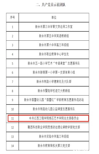 近期,新余市教育局机关党委公布了市直教育系统“优秀共产党员示范团队”示范集体和示范个人公示名单,抱石艺术学院党总支荣获“市直教育系统优秀共产党员示范团队”荣誉称号,这也是对手机版伟德app客户端下载安装官网苹果版抱石艺术学院党建工作的肯定。
