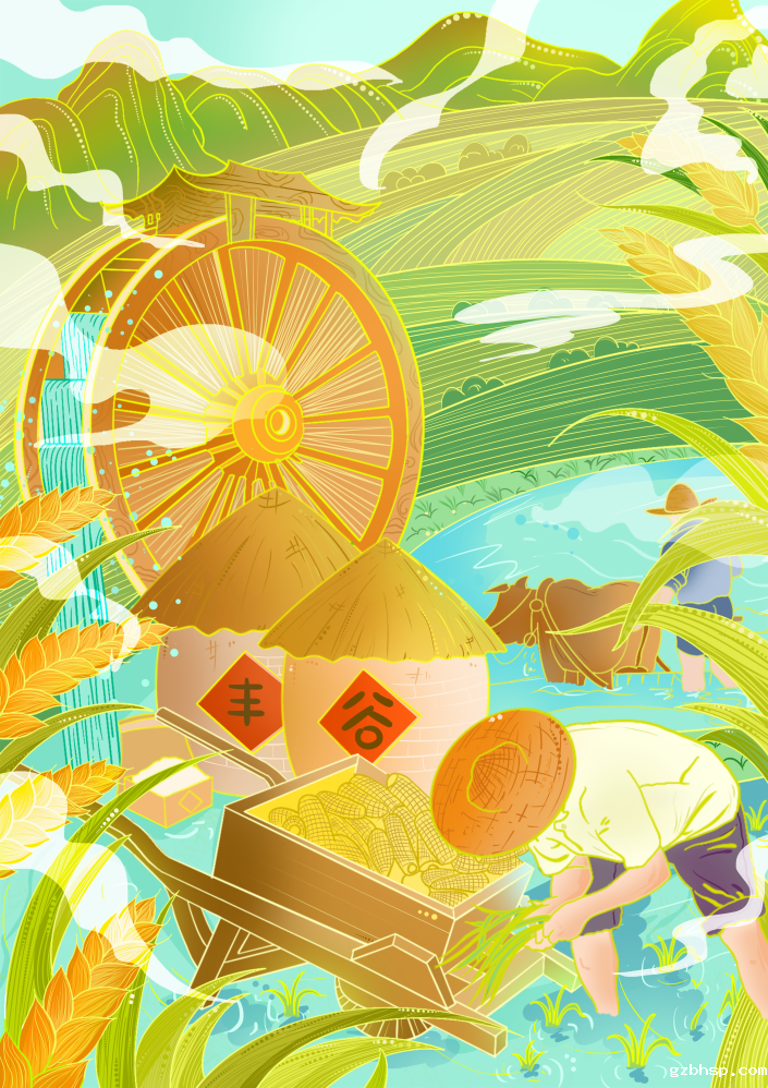 设计说明:本次插画设计以天工开物为主题,通过描绘天工开物、有麦穗、有水车、有玉米车的场景,展现传统农耕文化的魅力。将麦穗和水车置于同一水平线上,形成和谐的画面布局。玉米车和人物则位于画面下方,与背景的稻田形成对比,突出主题,以绿色为主色调,象征生机勃勃的田园风光,同时辅以金黄色和红色,分别代表麦穗和丰收,以及劳动者的勤劳与汗水。