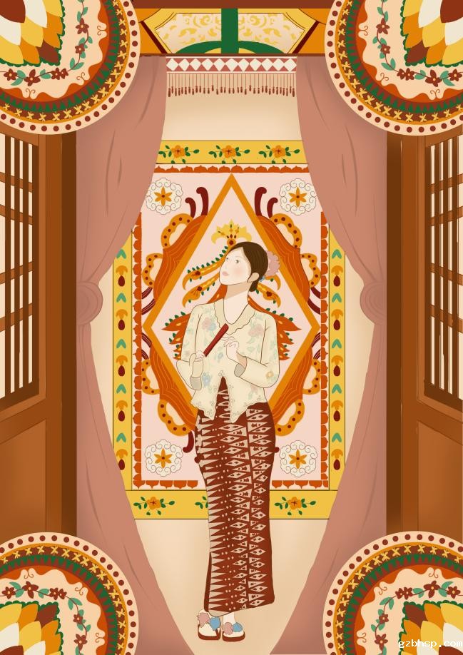 设计说明:以“峇峇娘惹”为主题,设计了一个以“小娘惹”为主体的插画设计,画面中的各色纹样都是从娘惹文化中的建筑,物品和服饰中提取,感受这南洋特色
