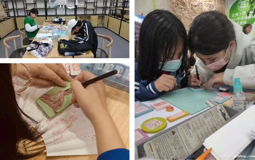 抱石篆印团是从事学生篆刻培训和篆刻艺术创作的大学生社团,其主要目的是继承和发扬篆印艺术。依托新余本土元素之一的傅抱石印章、书画为主要提取元素,转变传统印章的复杂工艺,结合现代印章新形式,以易呈现的、可DIY的橡皮章进行转化,通过树脂胶、纸艺等方式,将这些元素融合呈现在各类文创产品中。通过几年的发展,凝聚了一批热爱篆刻艺术的成员。