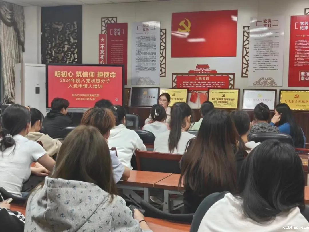 为深入贯彻习近平新时代中国特色社会主义思想,深入开展保持共产党员先进性教育活动,促进广大师生党员和入党积极分子在日常生活中发挥好先锋模范作用,3月24—25日晚上7:00,抱石艺术学院在202会议室开展“明初心 筑信仰 担使命”2024年度入党积极分子和入党申请人员培训会,入党积极分子和申请入党人员培训是一项重要的工作,旨在加强党员队伍建设,提高入党积极分子和申请入党人员的思想政治素质,为党的事业的发展提供有力的人才保障。