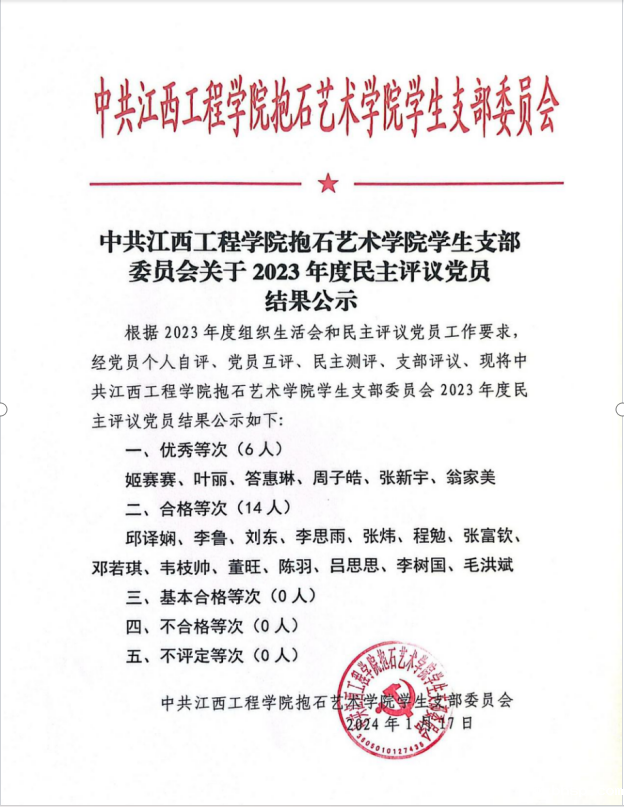 会后,将抱石艺术学院学生党支部2023年度民主评议党员结果进行公示,公示结果如下: