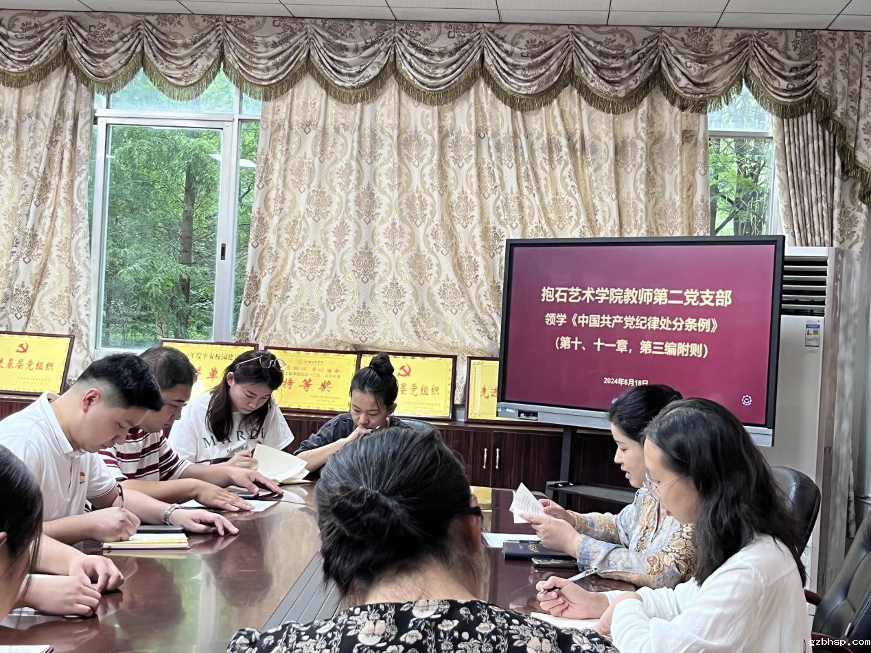 2024年6月18日16:00-17:00,抱石艺术学院教师第二党支部在抱石艺术学院202会议室开展《中国共产党纪律处分条例》第四次集中学习(第二编分则第十章——第十一章,第三编附则)。教师第二党支部书记张培就“严守纪律,担当尽责”为主题开展领学活动。此次活动以学习贯彻新修订的纪律处分条例为契机,将纪律要求内化于心、外化于行。