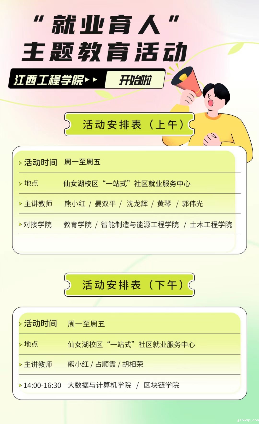 新时代人才强国战略对高校就业育人提出了新要求,“新就业形态”背景下高校就业育人面临着新挑战。为培养广大学生“成才观、职业观、就业观”,将就业教育和就业引导作为“三全育人”的重要内容,2023年3~4月,学校将在仙女湖校区“一站式”社区就业服务中心持续开展“就业育人”主题教育活动。详细信息请查收。